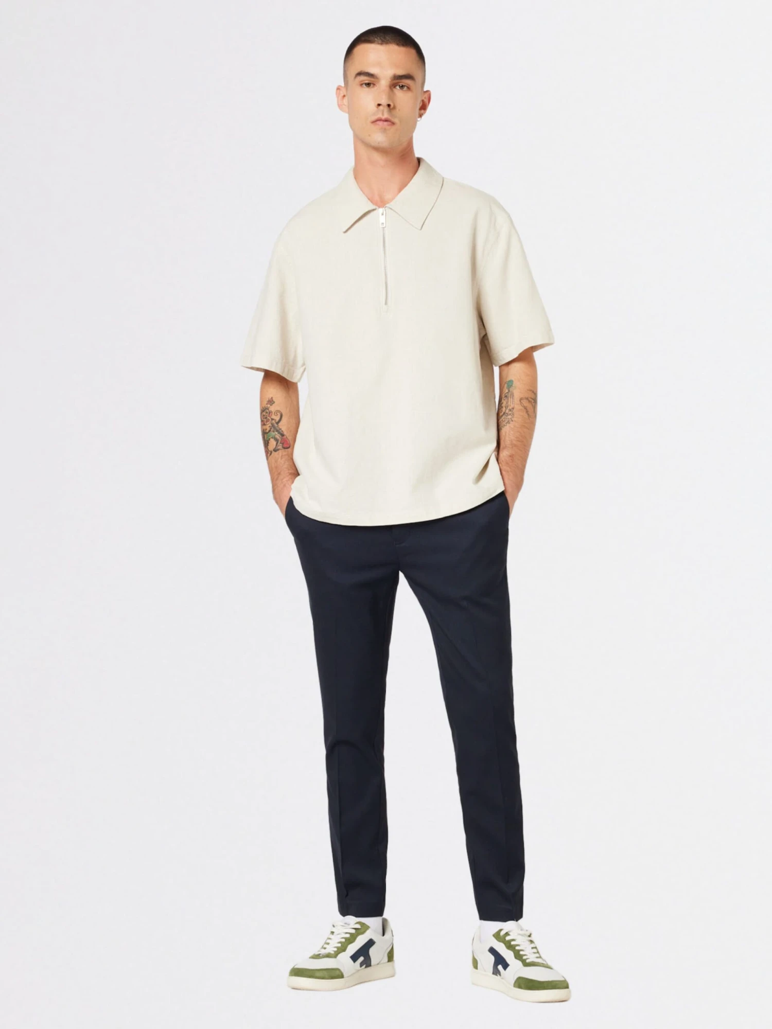 Couleur unieCotonCol poloÉpaules largesCol rabattuDemi-zipCoutures ton sur tonDoux au toucherFermeture à glissière